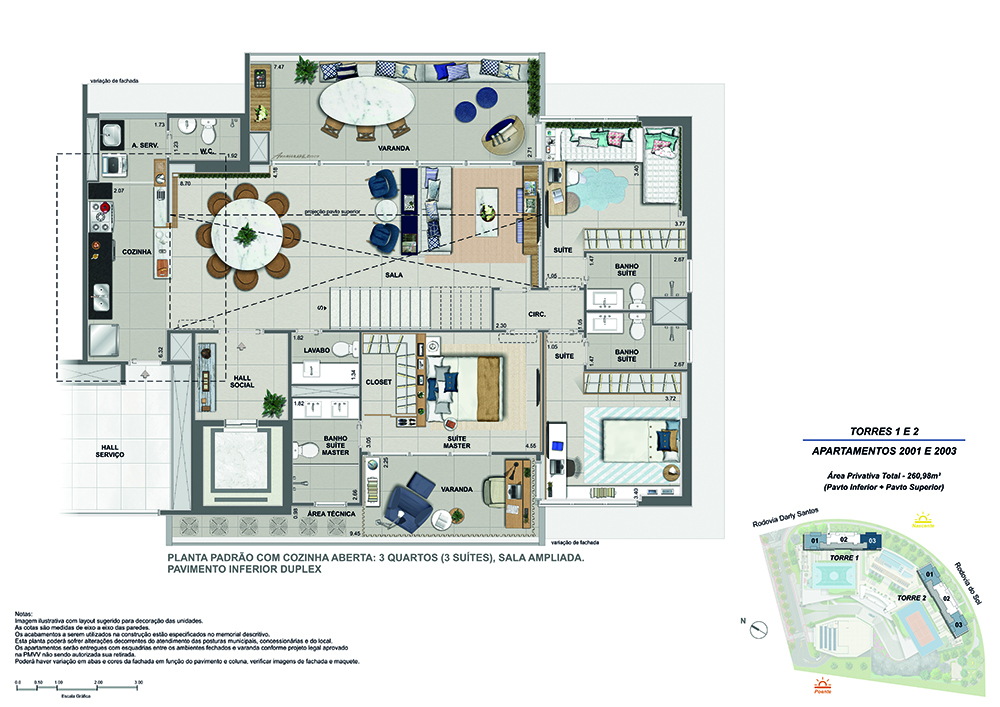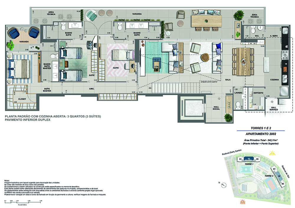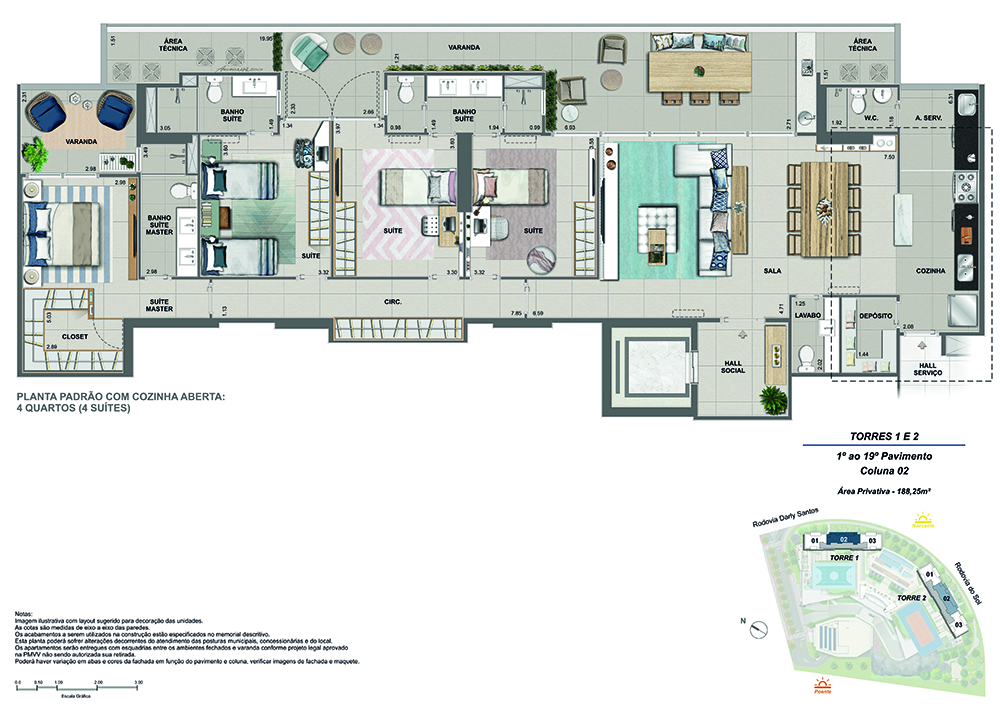 Apenas 2 torres com 120 unidades de apartamentos de 4 suítes, com 188 m², e 6 coberturas com até 342 m², em uma área de 14.000 m² com mais de 9.500 m² de lazer.